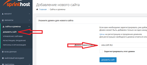 15). Далее выбираем пункт "добавить сайт" в разделе "сайты и домены". Так же в поле "Домен нового сайта" вставляем скопированный домен, перед ним вставляем имя Вашего сайта и обязательно точку после имени Вашего сайта. (Пример: я выбираю домен "UXP.RU", мой сайт будет называться "work", в итоге должно получиться так: "work.UXP.RU"). Далее жмем "добавить сайт".