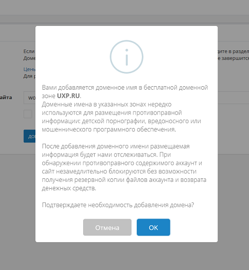 16). Часто, после добавления сайта всплывает предупреждение о том, что за размещенной на Вашем сайте информацией будут следить сотрудники хостинга. Здесь нужно нажать кнопку "ОК", соглашаясь с тем, что ничего противозаконного на Вашем сайте не будет.