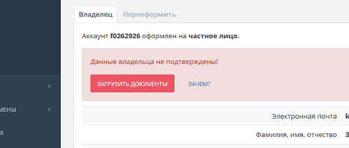 3). Следующим шагом нужно заполнить информацию о владельце аккаунта. Для этого переходим в пункт "владелец", который расположен в разделе "аккаунт".