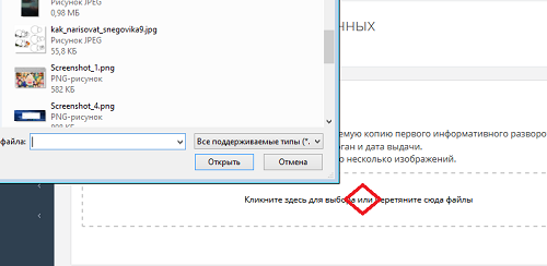 6). Для того, чтобы загрузить документ, удостоверяющий личность, его нужно сфотографировать или отсканировать и перенести на компьютер. Далее кликаем на то место, где на картинке указан ромб, в открывшемся окне выбираем нужный файл и жмем "открыть".