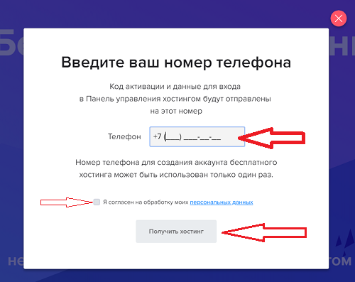 3). Всплывет окошко, в котором нужно будет ввести Ваш номер телефона и поставить галочку, согласившись на обработку данных. После чего жмем "получить хостинг".