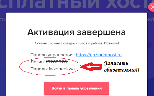 5). После завершения активации откроется окно с Вашими логином и паролем, их обязательно запишите в блокнот, чтоб не потерять. Ну а теперь жмем "войти в панель управления".