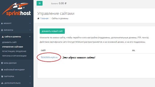 7). Для того, чтобы узнать адресс Вашего будущего сайта, нужно в левой колонке хостинга выбрать пункт "сайты и домены", а внутри него "управление сайтами".